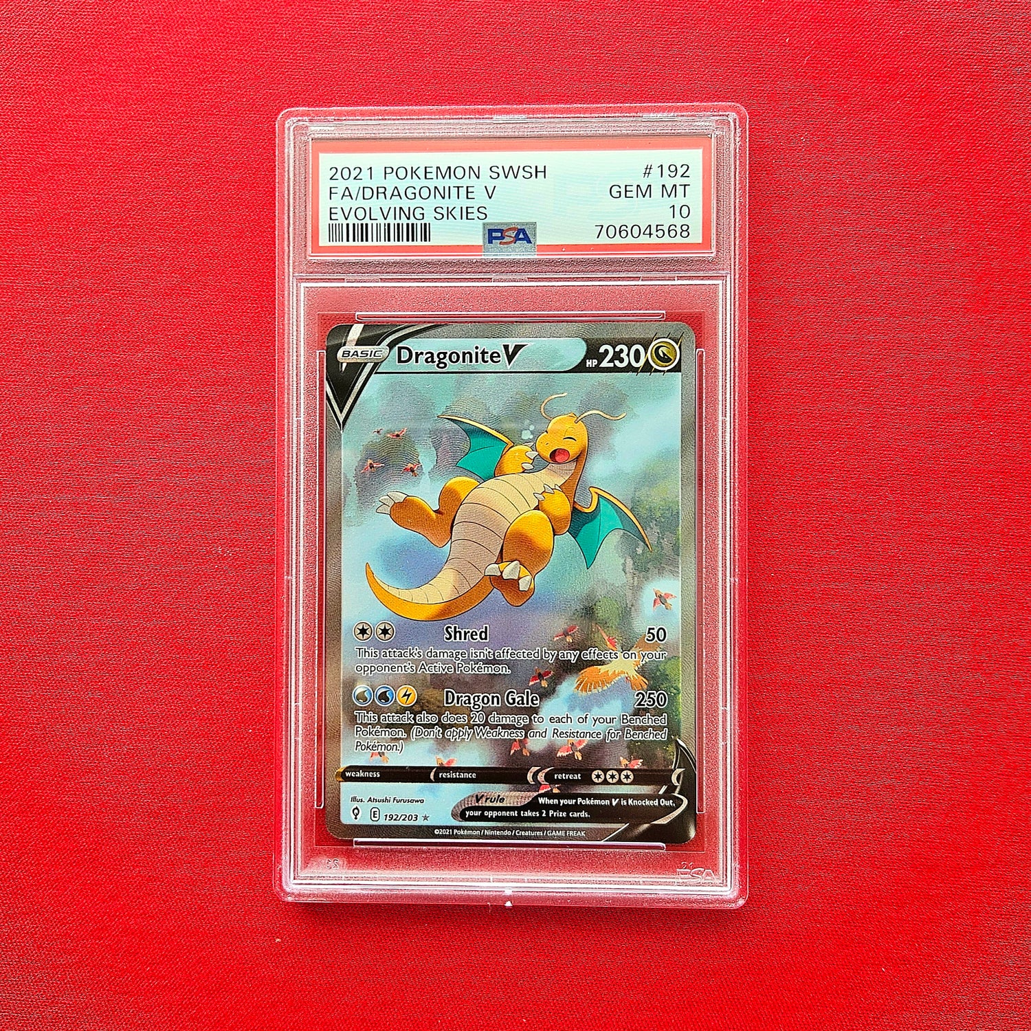 Diese Pokémon TCG - Dragonite V Alternate Art Karte aus dem Set Evolving Skies (2021) zeigt das beliebte Drachen-Pokémon in einer traumhaften, alternativen Illustration. Das Artwork fängt Dragonite in einer ruhigen, schwebenden Szene ein und gehört zu den beliebtesten Karten der Sword & Shield Ära. Diese Ausgabe wurde bei PSA mit der Bestnote 10 (GEM MINT) bewertet und befindet sich in perfektem Zustand – ohne Druckfehler, Kratzer oder Abnutzung. Dank der Kombination aus ikonischem Pokémon, atemberaubendem Design und makelloser Qualität ist diese Karte ein begehrtes Sammlerstück für Liebhaber und Investoren gleichermassen.