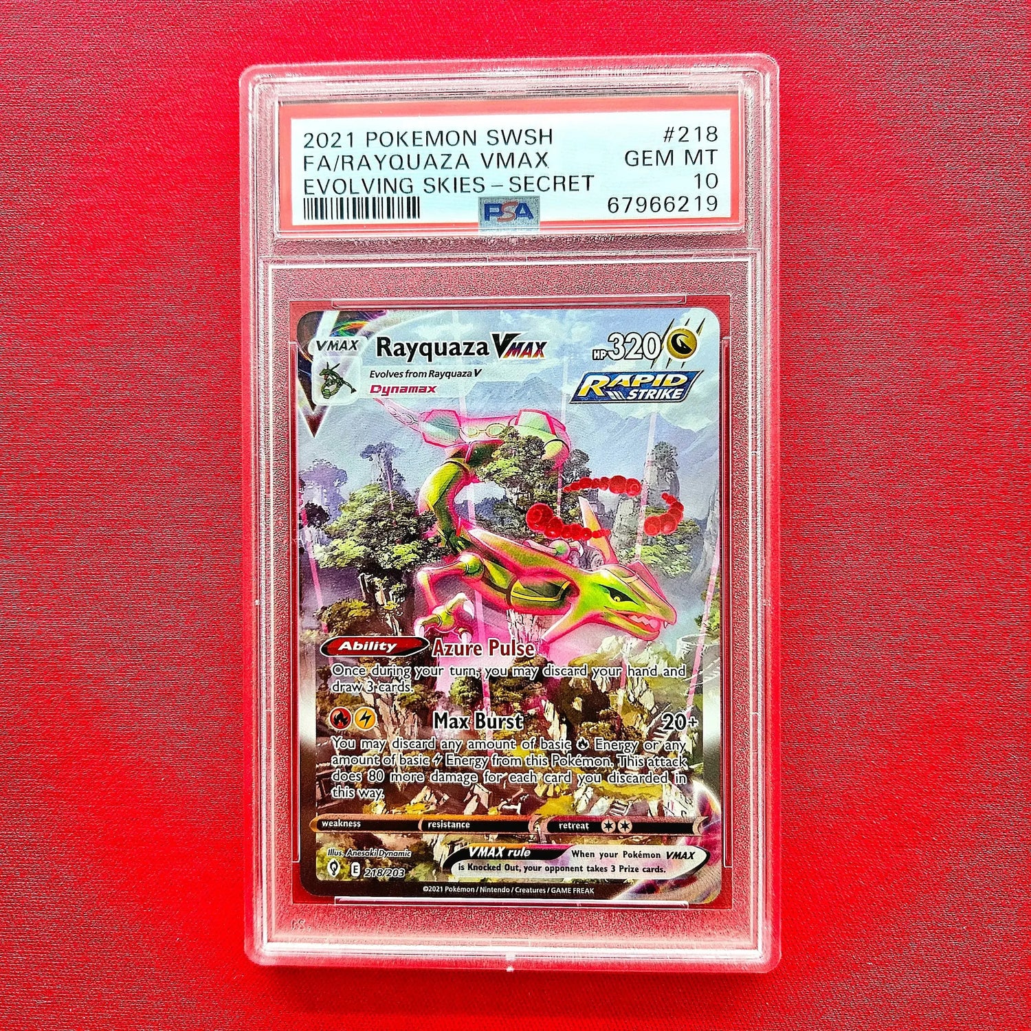Sichere dir das Rayquaza VMAX 218/203 Alt Art Evolving Skies GEM MINT PSA 10 und erweitere deine Pokémon-Sammlung um ein echtes Meisterwerk. Bestelle jetzt bei LaschoCards.ch und erlebe die Faszination der Pokémon-Welt in ihrer besten Form!